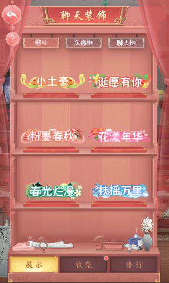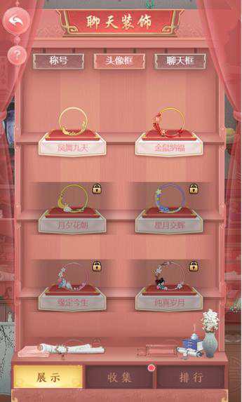 展示界面内会展示所有已开放的头像框、称号、聊天框。