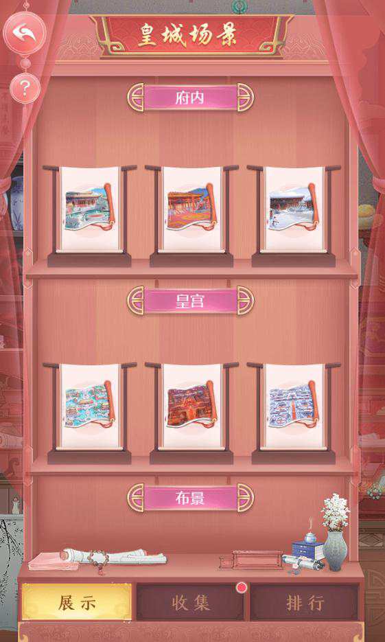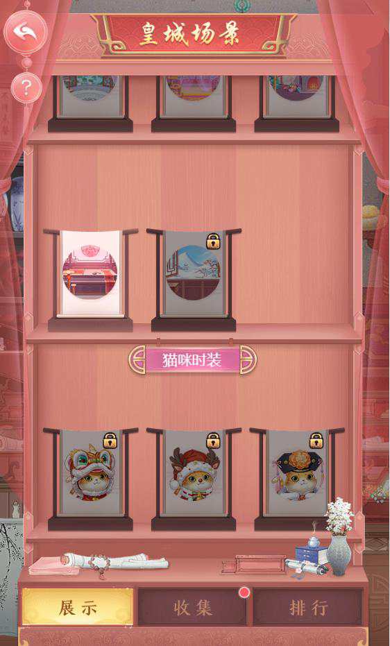 展示界面内会展示所有已开放的府内场景、皇宫场景、布景、猫咪时装。