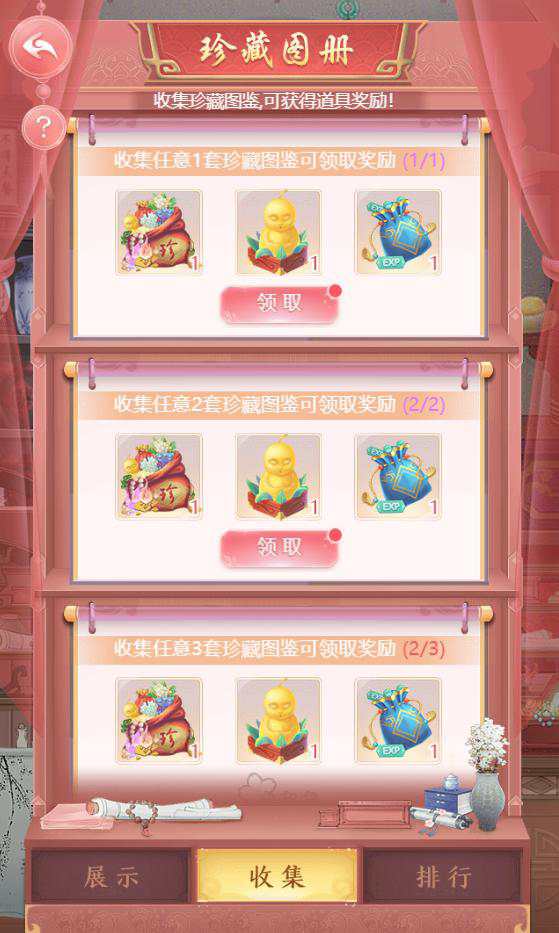 珍藏图册、聊天装饰、皇城场景收集达到指定条件后,可领取对应道具奖励。