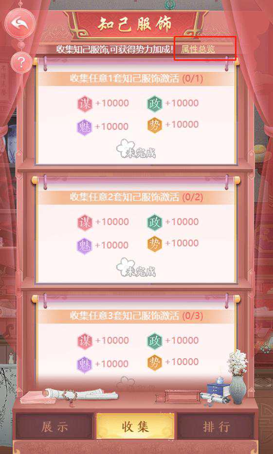 知己服饰收集达到指定条件后,可获得势力加成(可点击属性总览查看当前加成哦)~