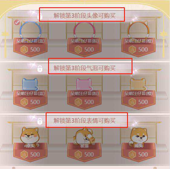 先兑换上一阶的物品后才可以兑换下一阶的物品(上一阶段物品只需同类型物品解锁一个后,即可解锁下一阶段的同类型物品,无需全部解锁)。