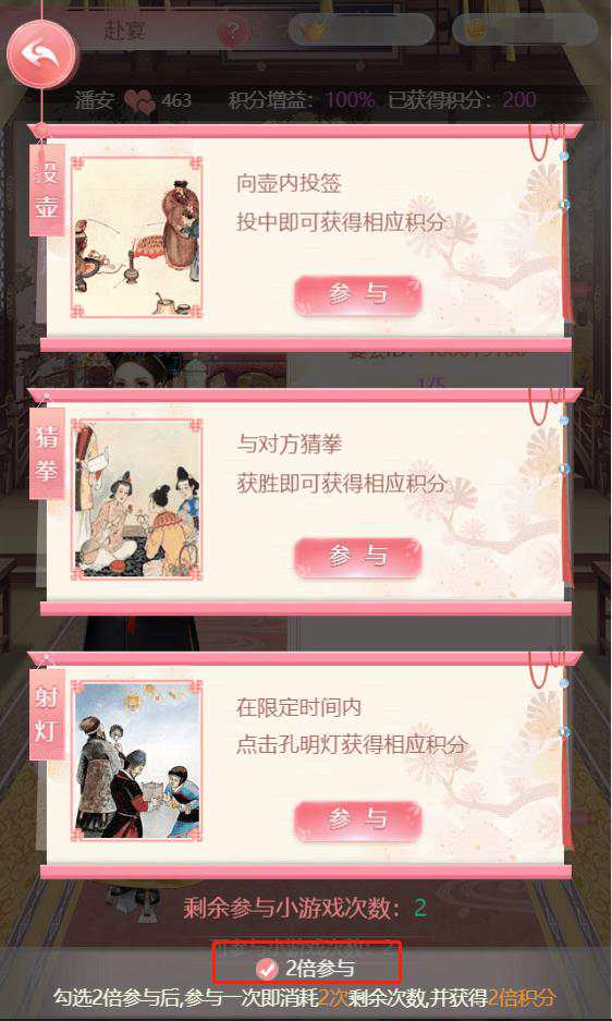 3、宴会小游戏增加“多倍参与”选项,在前往其他小主的宴会赴宴时,参与小游戏前勾选多倍参与,可以一次消耗多次的参与次数获得相同倍数的积分。